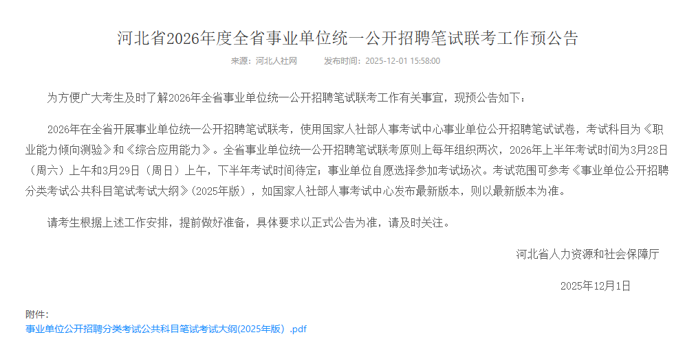 近日,河北人社发布《河北省2026年度全省事业单位统一公开招聘笔试联考工作预公告》,明确2026年全省将统一参加国家人社部人事考试中心组织的事业单位联考,笔试科目为《职业能力倾向测验》和《综合应用能力》。并提到,考试范围参考《事业单位公开招聘分类考试公共科目笔试考试大纲(2025版本)》。