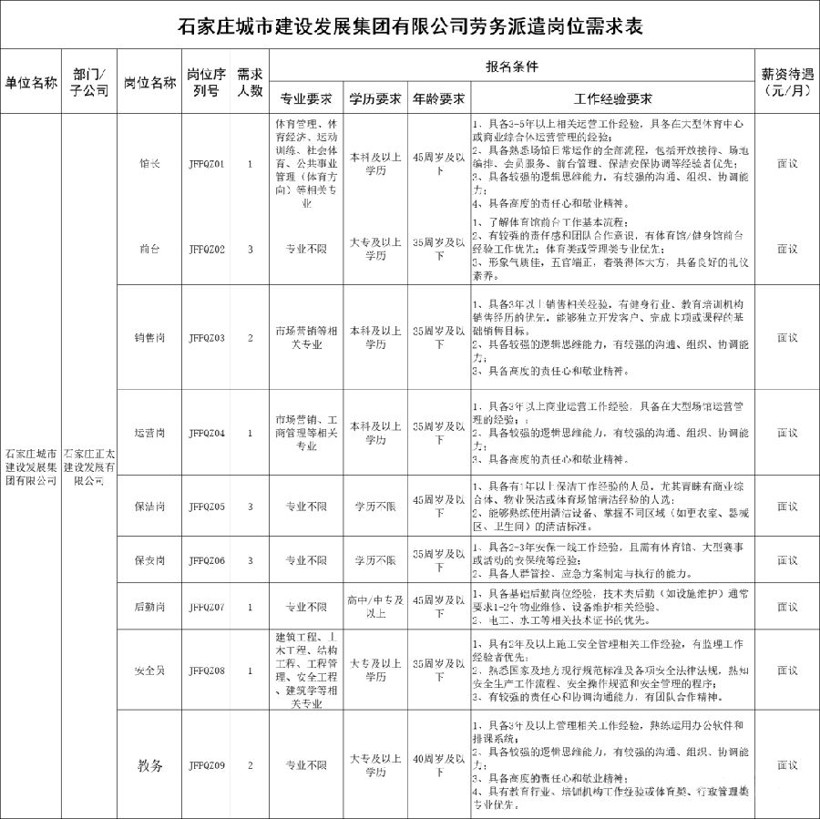石家庄城市建设发展集团有限公司,成立于2022年4月,为国有全资企业。经营范围主要包括:土地整治服务;房屋拆迁服务;企业管理咨询;工程管理服务;物业管理;会议及展览服务;污水处理及其再生利用;停车场服务;非居住房地产租赁;房地产经纪;房地产咨询;市场营销策划;销售代理。目前主要承担太平河片区和正太广场周边区域建设工作。 根据工作需要,石家庄城市建设发展集团有限公司特委托石家庄市国经人力资源管理有限公司面向社会公开招聘劳务派遣制人员17名。现将具体招聘流程设定如下: 招聘工作坚持德才兼备的用人标准和“公开、平等、竞争、择优”的原则,面向社会实行市场化公开招聘。 采取网上报名、资格初审、资格复审、面试、体检、拟录用等步骤进行。 报名时间:2025年12月24日-2025年12月30日17:00。 报名网址:石家庄国经人才服务网(https://www.sjzhrgroup.com/) ①进入网页点击“登录/注册”完成个人账号注册并进行登录(初次使用本平台报名人员,请先进入“个人中心-我的信息”中上传岗位要求的相关附件)。查看河北各地最新招聘信息 ②点击“劳务派遣”进入对应公告报名参加并选择报名岗位--点击“填写报名信息”填写《个人信息登记表》(带*号内容均为必填项,如不涉及则填写“无”)--点击“提交”完成报名。 每名应聘者限报考一个岗位。为避免报名后期网络拥堵,请应聘者尽早报名。本次应聘实行诚信报名机制,应聘者必须对提交审核报名信息的真实性负责。资格审核贯穿应聘工作全过程,在任何环节发现应聘者不符合应聘条件的,一经查实,立即取消应聘资格,有弄虚作假行为的要追究责任。 资格初审标准:依据招聘岗位设置的条件进行资格审查。 应聘者提交报名后,系统将在2个工作日内反馈报名结果,应聘者可在“个人中心-我的报名-初审结果”进行查看。待审核及审核通过状态下无法再修改报名信息,审核结果为“审核未通过”者,可根据反馈原因修改信息后重新提交审核。 进入资格复审的人选需提供以下证件和材料:按照招聘岗位条件要求能够证明自己资格条件的相关材料,经审查无误后方可进入下一环节。资格复审的时间地点将以邮箱的形式发送至应聘者个人邮箱,请及时关注并按时参加资格复审。查看河北各地最新招聘信息 时间、地点、携带资料将以邮箱的形式发送至应聘者个人邮箱,请及时关注并按时参加面试。 面试成绩满分为100分,按成绩排名择高进入下一环节。 面试合格者进入体检环节。体检人员需符合入职体检要求,体检合格的,进行下一环节。体检不合格的,取消拟录用人选资格。体检费用自理。并按总成绩从高分到低分依次递补。 1.经体检合格的拟录用人员,按规定与石家庄市国经人力资源管理有限公司签订劳务派遣合同,办理录用手续。 2.在办理录用手续期间,不在规定时间报到的,取消其录用资格,并按总成绩从高分到低分依次递补。 1、网上报名实行严格的自律机制,应聘者须确保本人提供信息的真实性。凡弄虚作假者,一经发现,即取消录用资格。已经录用的,解除与其签订的劳动合同。问题严重的,报有关部门追究责任。 2、凡应聘者未在规定时间内按要求参加资格复审、面试、体检等情况的,均视为自动放弃应聘资格;资格审核贯穿招聘工作全程,在任何环节,发现应聘者不符合招聘条件,对学历和工作经验弄虚作假的人员,取消应聘资格,问题严重的要追究责任。 3、应聘者在网上报名时,务必填写本人常用的联系方式,并在招聘期间保持手机等通讯设备畅通,因通讯不畅错过招聘环节的,自行承担责任。因个人原因造成证件丢失、被他人盗用或信息被恶意篡改而影响招聘的,自行承担责任。 4、招聘期间,应聘者需自行关注邮箱信息,如有问题及时联系工作人员,未入围者不再另行通知。 咨询电话:0311-86960522/86960523(工作日9:00-12:0013:00-17:00)