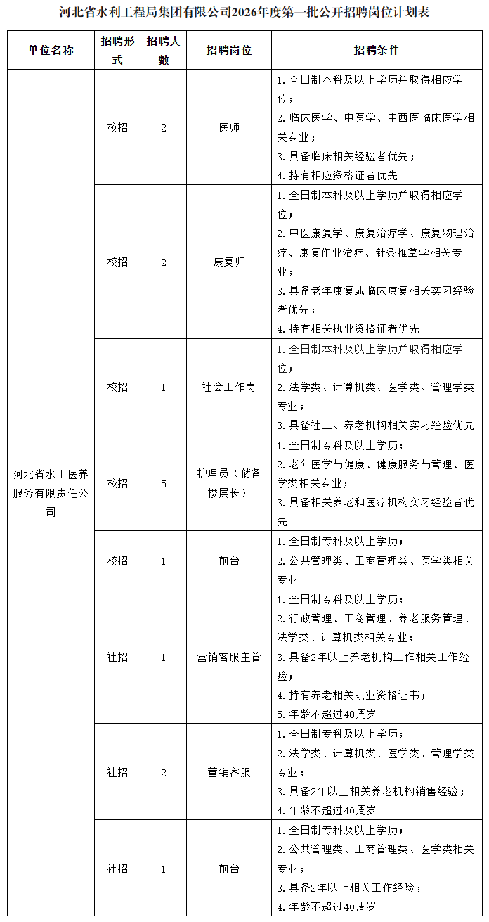 本次公开招聘工作人员共15人,招聘岗位、数量和要求详见《河北省水利工程局集团有限公司2026年度第一批公开招聘岗位计划表》(附件1)。