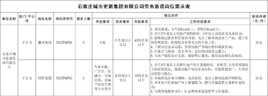 据工作需要,石家庄城市更新集团有限公司特委托石家庄市国经人力资源管理有限公司面向社会公开招聘劳务派遣制人员6名。现将具体招聘事宜公告如下: